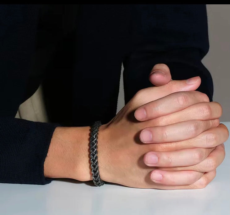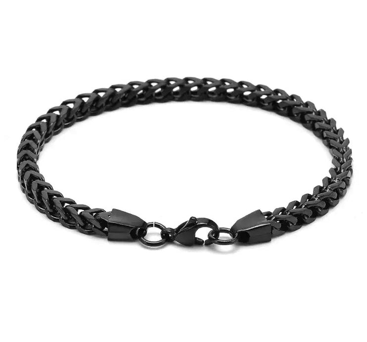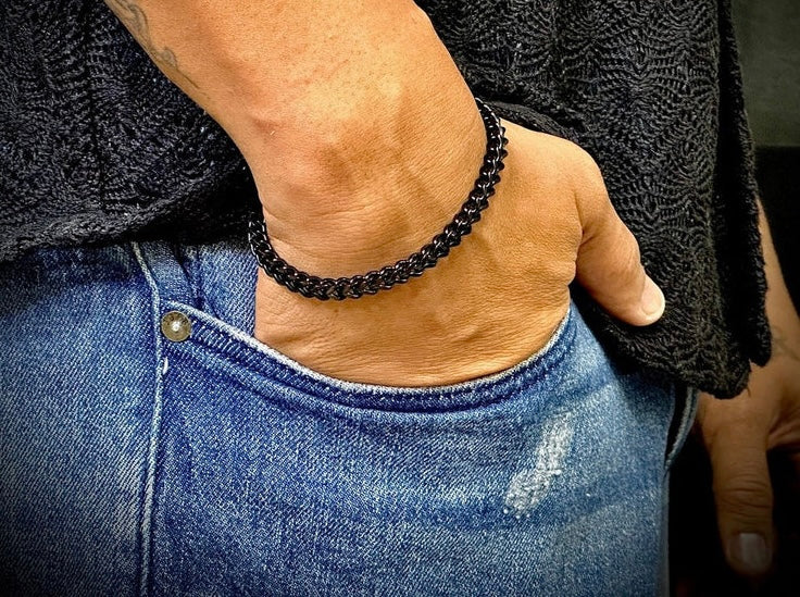 Introducing the Black Stylish link Bracelet. Crafted with sleek, black links, this bracelet adds a touch of elegance to any outfit. Made from high-quality materials, it exudes durability and sophistication. Elevate your style with this timeless accessory that complements any occasion.