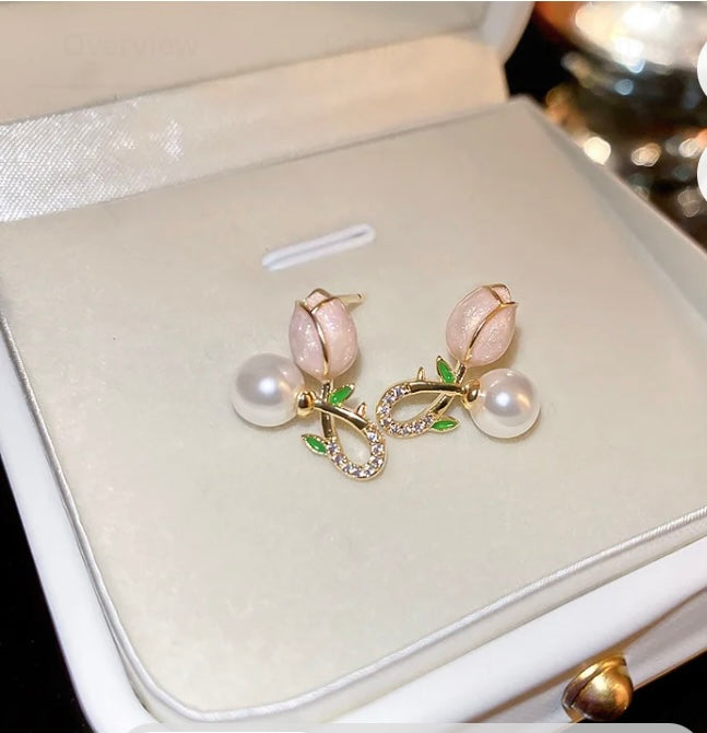 These French style tulip flower earrings feature sparkling zirconia, creating a delicate and elegant look. Perfect for women who want to add a touch of sophistication to their outfits, these earrings are a must-have accessory. Experience the beauty and versatility of zirconia with these stunning earrings.